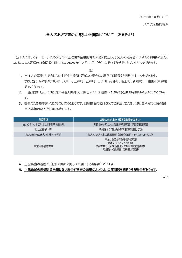 2025年12月2日(火)から、法人のお客様の口座開設に際しては下記のとおり