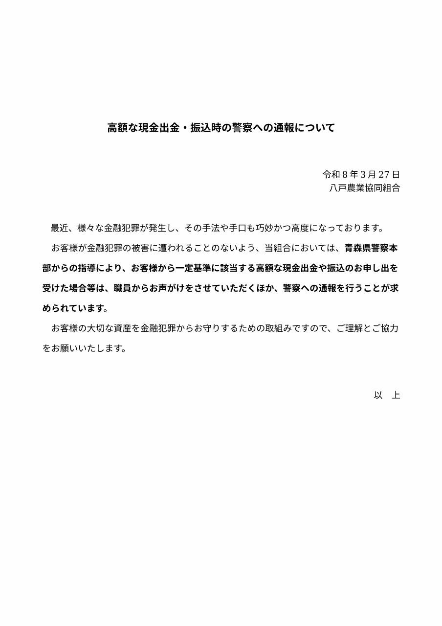 高額な現金出金・振込時の警察への通報について
