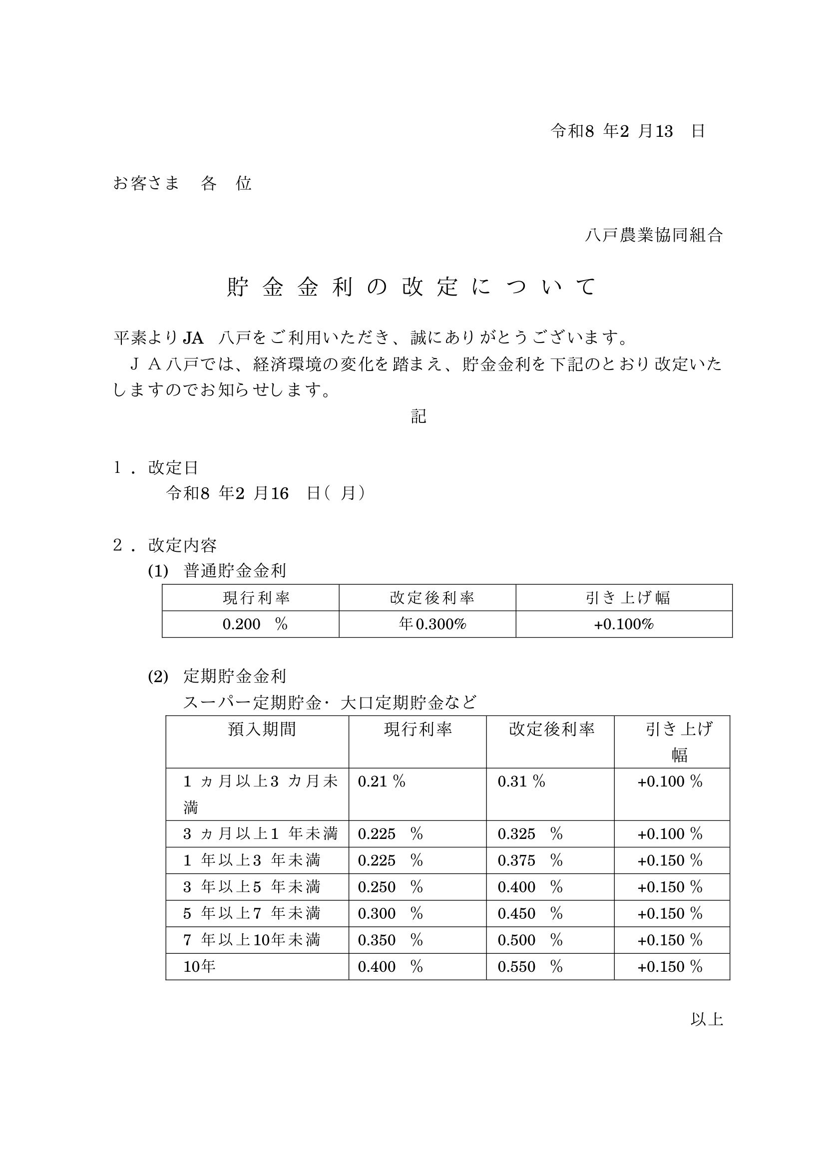 貯金金利の改定について